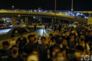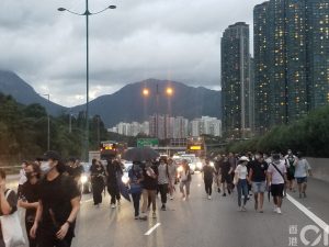 【21:10】有大批示威者經北大嶼公路離開東涌,經過近3小時後,示威者已步行到欣澳一帶,沿路有車輛「義載」部份人離開大隊