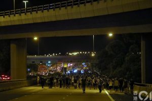 【19:28】北大嶼山公路,有傳後方有十輛警車將從後駛至,示威者開始離開路肩、霸佔馬路面共三條行車線,望爭取更多時間令其他人離開,有人一度奔跑。