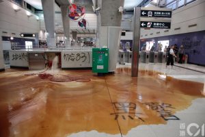 【17:56】東涌站連接東薈城的出口落閘,有職員促在場人士離開。有穿黑衣示威者仍在站內以消防喉向地面射水。