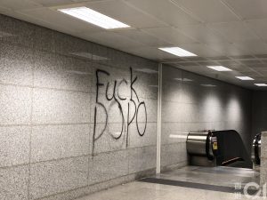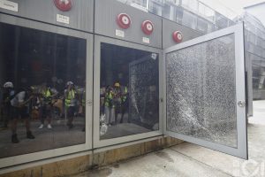 【15:40】有示威者以硬物擊碎並撞開一塊玻璃,內有消防灑水裝置。亦有示威者用椏叉射擊一輛停泊現場的港鐵貨車,亦有人在車上以噴漆留下字句。