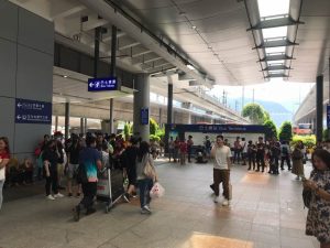 【14:42】在青衣站,有港鐵職員向仍等候免費的士的市民表示,的士大多已不願意前來接載市民往機場,呼籲他們自行去東涌乘巴士往目的地,現場市民一度鼓譟。有操普通話的旅客到場才發現機鐵服務暫停,有市民主動讓他們優先乘的士離開。