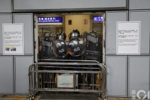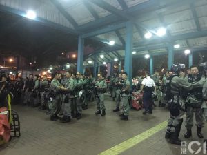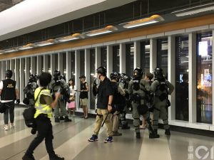【21:50】天水圍西鐵站內有約20-30名防暴警察,期間截查途經的市民,部份人要搜身及查看隨身物品。就現場記者所見,有警員有配備長槍,亦有旗手。
