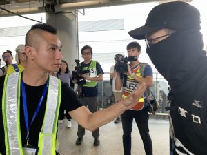 【13:20】有十幾名黑衣人在機場廁所和其他位置從四方八面湧出機場接機大堂,有機場保安隨即追逐,黑衣人其後跑離機場大樓。