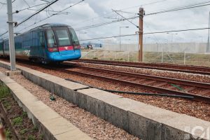【16:26】有一條綠色的鐵支被放在機鐵路軌上,致一列機鐵列車需停在前方,未能駛離。