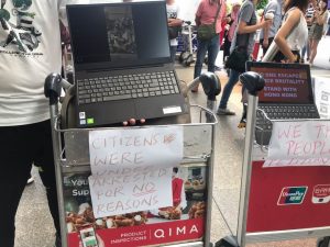 【12:35】在機場大樓外,有巿民以電腦播放昨天太子站衝突事件的片段。