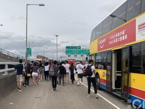【16:49】青馬大橋入機場方向交通嚴重擠塞,大批人士選擇在大橋落車開始徒步行去機場。