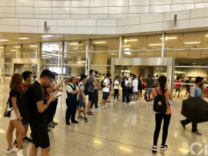 【14:02】有警架設鐵馬,相距二百米外的示威者及市民氣氛高漲,高呼「黑警還眼」。保安手拉手組人鏈防止攻入水馬後範圍,十多名防暴警暫時在機場內範圍戒備。