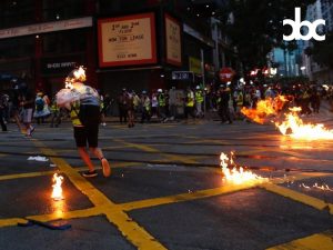 【17:55】城市廣播報道指,杜老誌道大公報對出,港台記者被燃燒彈擊中,頭盔及攝影機著火,有身穿黑衣示威者上前嘗試撲熄火種,目前記者已送往律敦治醫院治理