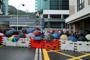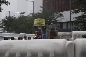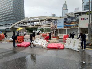 【16:32】灣仔稅務大樓對開告士打道,示威者用雪糕筒築起路障