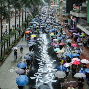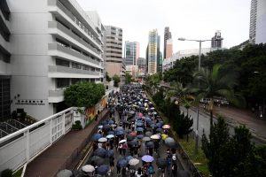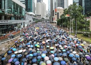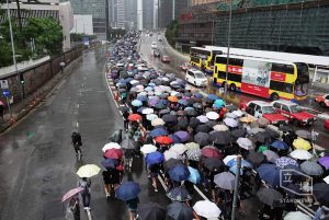 【14:44】港島遊行隊伍行至金鐘,沿途高呼「香港人,反抗」,又高舉五指,象徵五大訴求