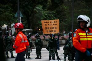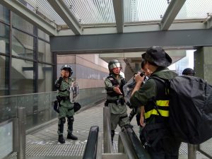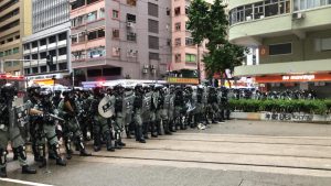【15:56】窩打老街近九龍塘軍營,防暴警察手持盾牌,築成防線,高舉藍旗。示威者向旺角方向撤退