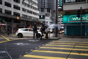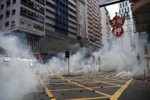 【17:11】灣仔駱克道街市外,防暴警察施放催淚彈。示威者在告士打道向銅鑼灣方向撤退