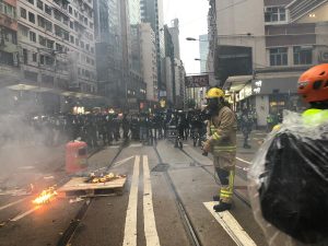【17:43】在灣仔,防暴警察築起防線。消防員到場,救熄示威者早前焚燒雜物引起的火種