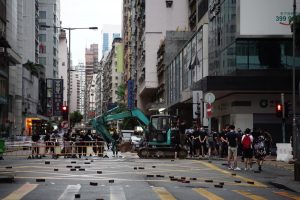 【17:29】灣仔駱克道和杜老誌道交界,以挖泥車作為路障