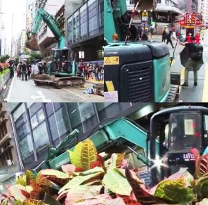【17:17】灣仔駱克道和杜老誌道交界,有人操作一架挖泥車,前進一小段,吊臂亦能移動