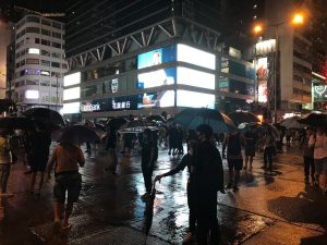 【18:11】銅鑼灣 SOGO 門外,示威者焚燒雜物。然而,紙皮早前被大雨沾濕,火勢並不猛烈