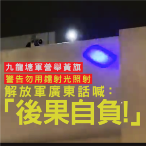 【19:30】九龍塘窩打老道有示威者用鐳射筆照向解放軍軍營,軍營內有軍人用強光照射示威者,高舉繁體字黃旗,警告「你正在違反法例,可能被檢控」,並開咪用半鹹淡廣東話警告示威者「後果自負」