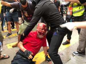 【17:58】旺角亞皆老街匯豐銀行附近彌敦道,一名中年男子被六七名示威者掌打腳踢。十分鐘後救護車到場,地上留下血跡